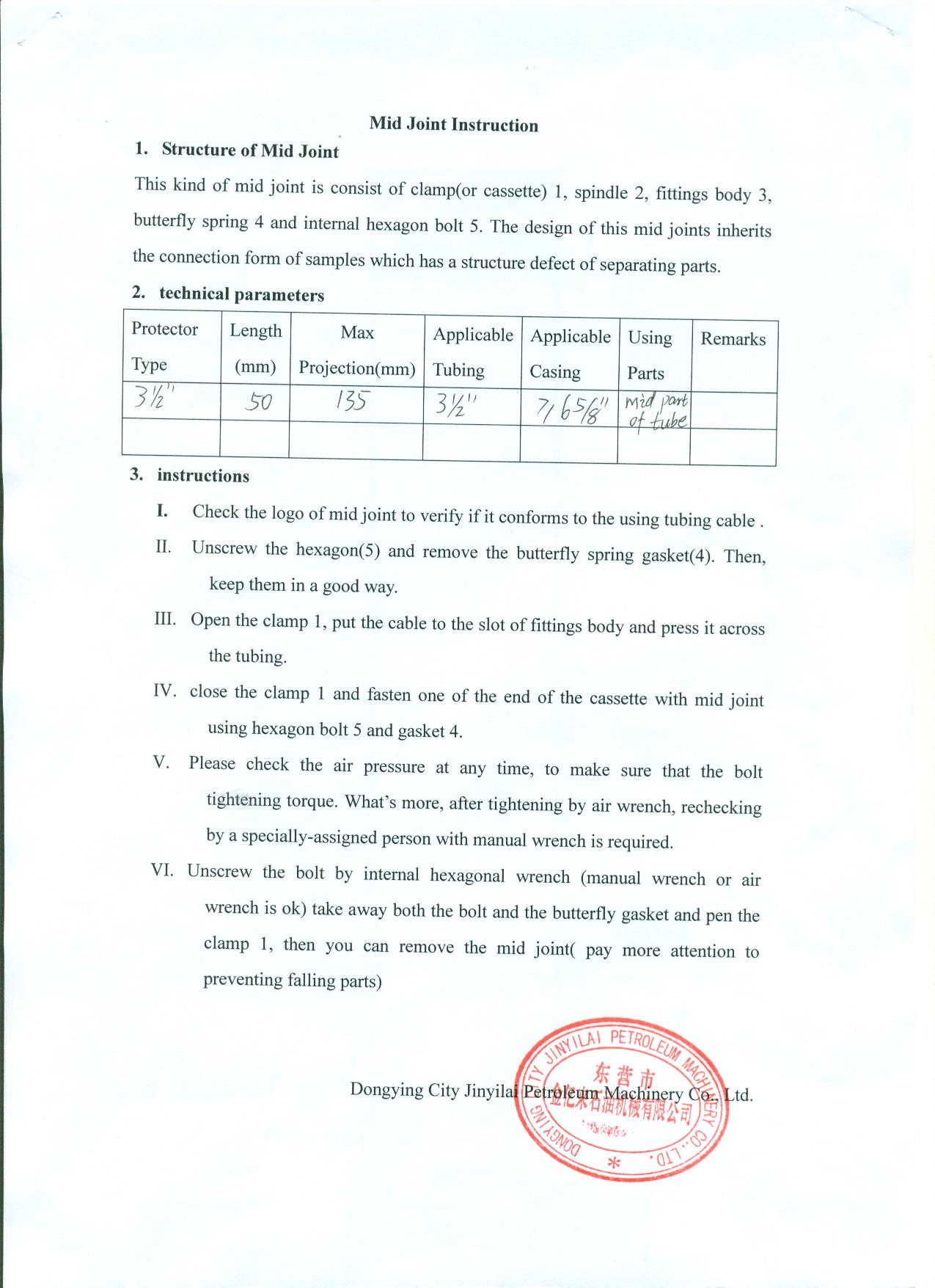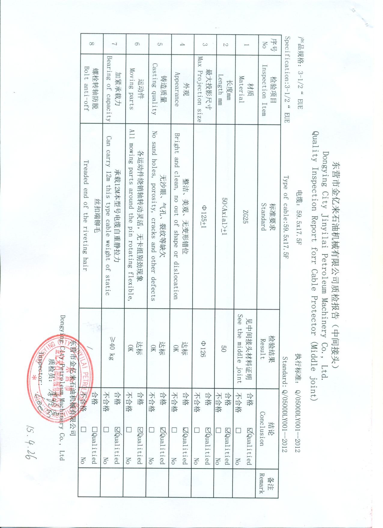 In order to better develop the international market and meet the needs of the South American market, zhongyuan Petroleum services S.A , Dongying City Jinyilai Petroleum Machinery Co., Ltd jointly developed 31/2″EUE.59×17.5F and 27/8″EUE.59×17.5F these two kinds of stamping type cable protector and Middle Joint.